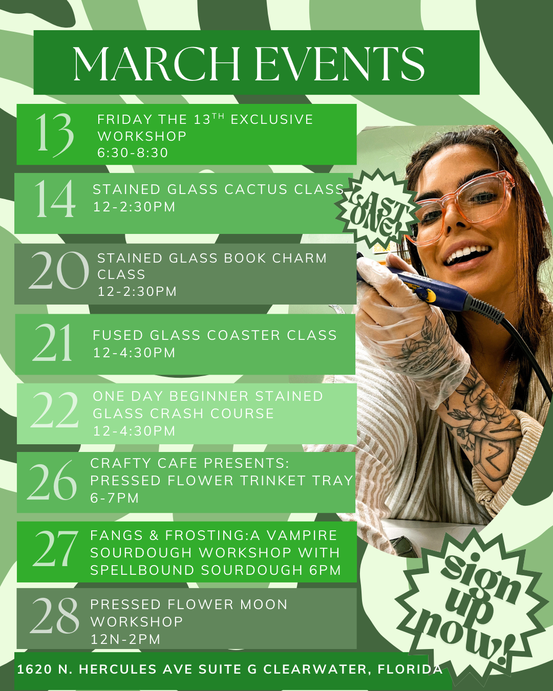 Sucking at something is the first step at being sorta good at something! Come hang out and take that first step with us and learn something new! We offer a variety of rotating classes from multiple resident artists including stained glass, resin, coffee roasting, embroidery, candle making, and more!