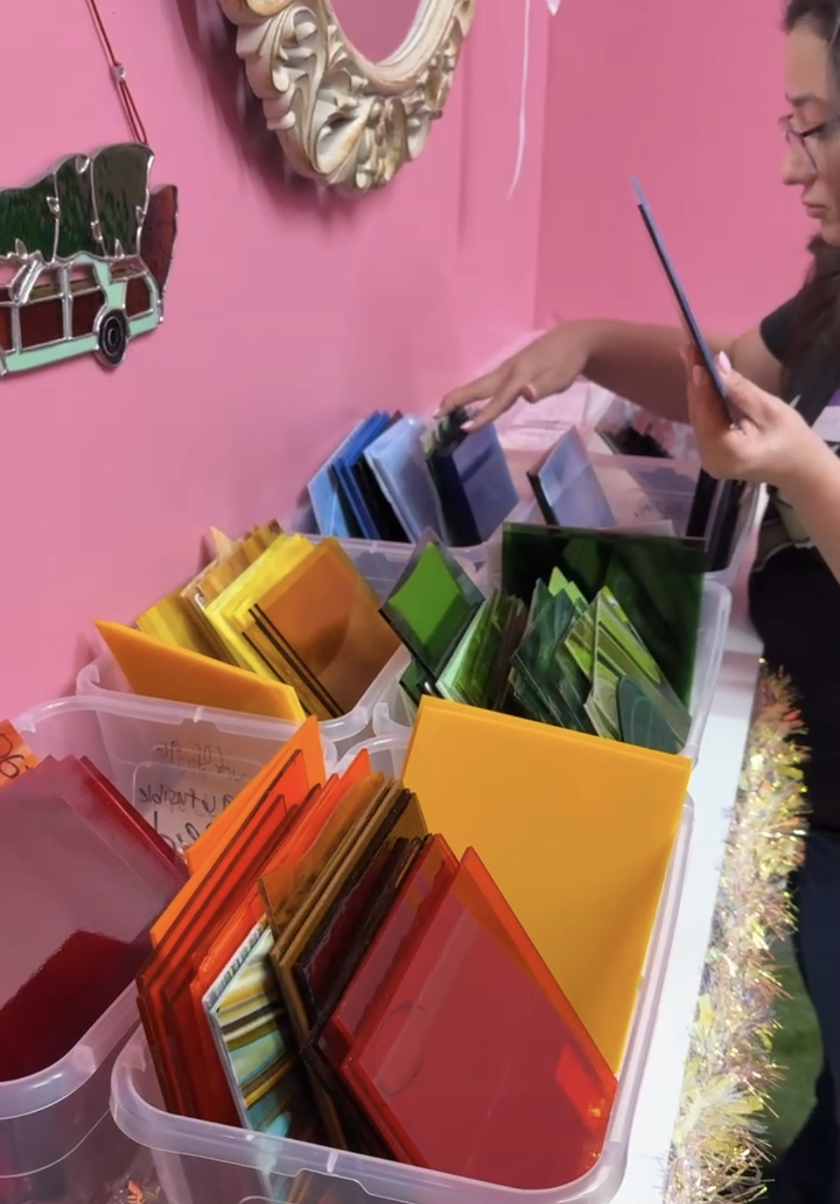 The cost will include use of the space, all tools, and most supplies. The only supplies that you will need to purchase separately are glass & metals (solder, copper foil, lead came, zinc border, & chain). All non-included supplies can be purchased from my studio or you can purchase these items elsewhere and bring them with you. We also have a great section of free glass that participants of open studio are welcome to use in their projects as well as our beginner class patterns!